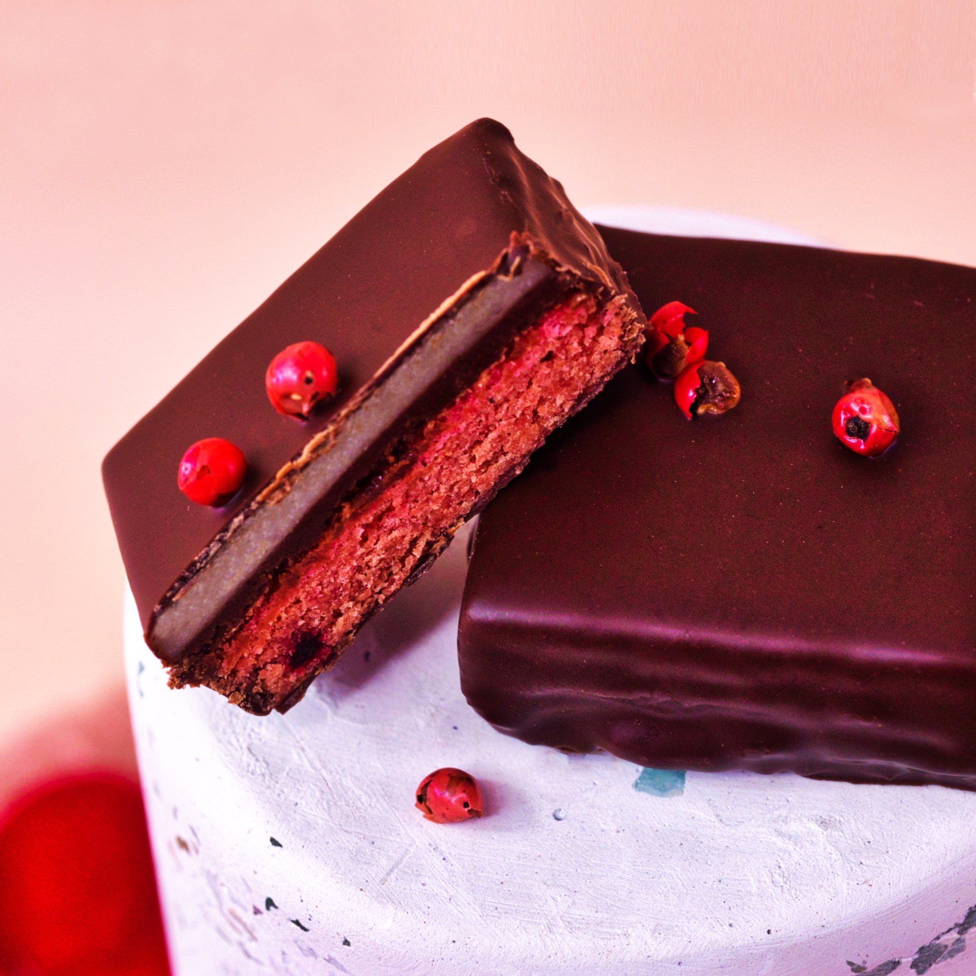 Feine Schichtung in pflanzlicher Perfektion: Veganer Waldkuchen trifft auf Rosenganache mit natürlichem Aroma, eingebettet in Marzipan und überzogen mit edler Zartbitterschokolade. Rosa Pfeffer verleiht dieser Praline eine zarte Schärfe – floral, würzig, außergewöhnlich.